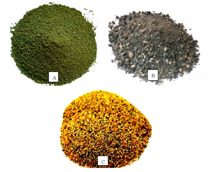 針對石料的形狀劃分了六種不同類別,分別是:圓型、不規(guī)則型、角錐型、扁平型、長條型及扁長型。在這六種形狀中,可以用角錐型和不規(guī)則型形容機制砂的粒形。機制砂的粒形因母巖種類不同、機制砂生產(chǎn)設(shè)備不同也會不同,如下圖A、B兩種機制砂是不同生產(chǎn)設(shè)備制備的機制砂,A的粒形較好,B的粒形較差,C是與A、B母巖不同的機制砂,顏色接近黃沙。