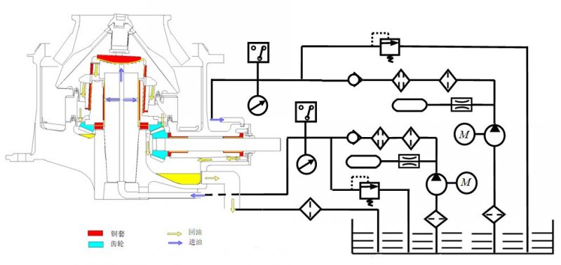 圓錐破碎機主要通過稀油循環(huán)的方式進行潤滑,它的潤滑系統(tǒng)主要由潤滑油流道、摩擦副、油箱、電動機、油泵、過濾器、安全閥、蓄能器、壓力表、壓力開關及通氣裝置等組成,如下圖所示。